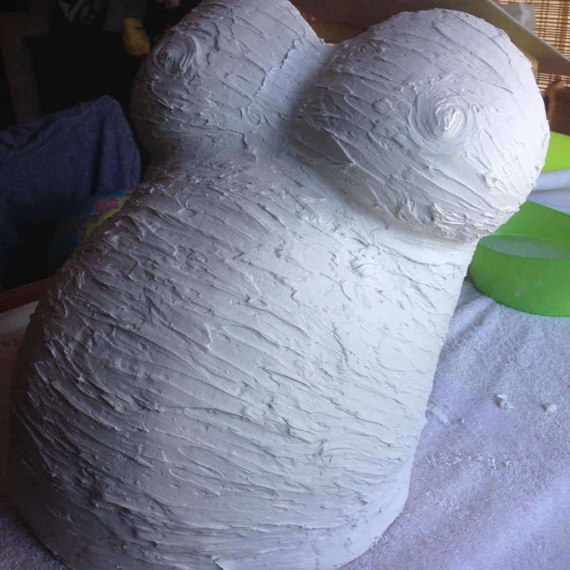 We start by placing strips of plaster gauze, dampened in warm water, over your body. Based on the shape you have requested the plaster may be applied over your belly, breasts, shoulder, neck, upper thighs, etc. Several layers are needed to make the cast sturdy, but not too heavy.